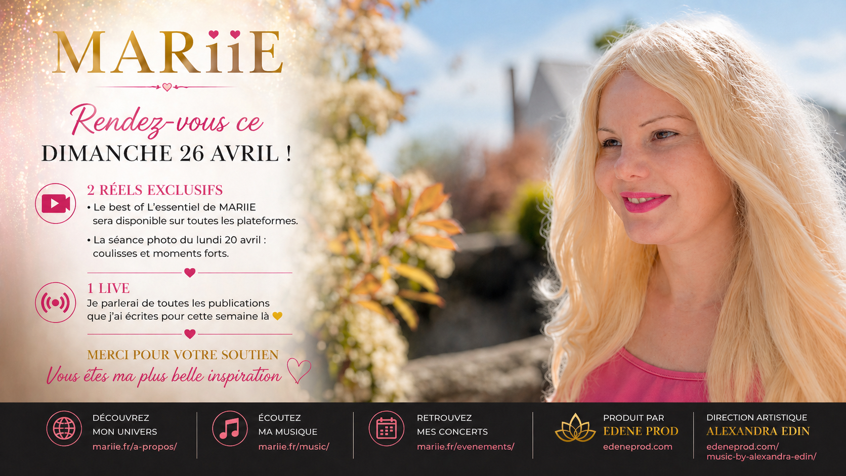 L’actualité de Mariie prend une dimension encore plus interactive ce dimanche 26 avril. L’artiste renforce sa présence digitale en proposant une série de contenus pensés pour rapprocher toujours davantage son univers de son public.