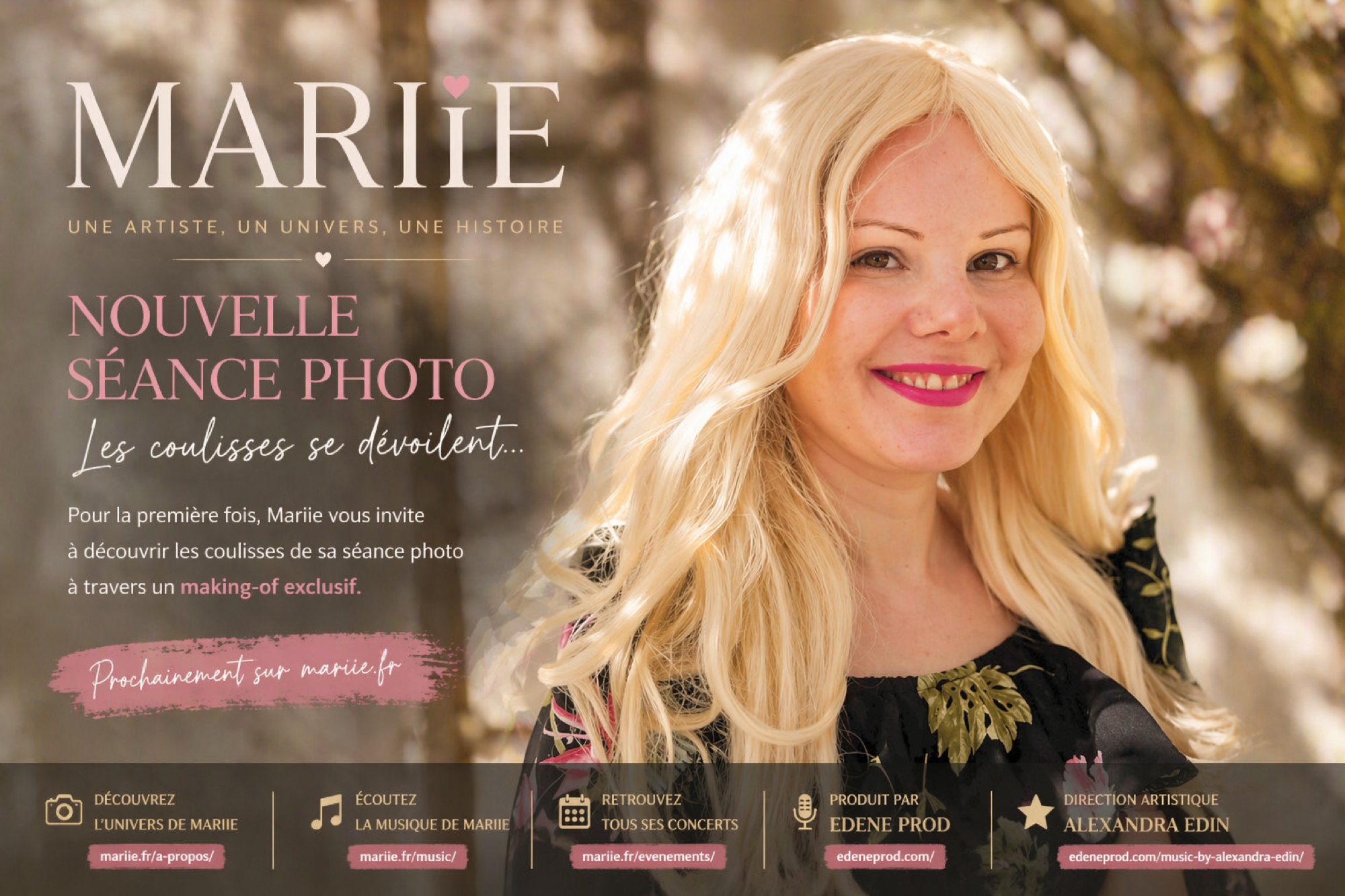 Accompagnée par EDENE PROD, Mariie construit progressivement une identité forte, à la croisée de l’émotion et de l’esthétique. Ce nouveau format de contenu vient enrichir cette dynamique, en apportant une dimension immersive supplémentaire.